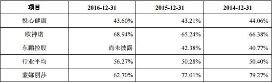 另外,由于去年6月,在香港上市三年的東鵬控股正式從香港退市。因此,東鵬控股2016年資產(chǎn)負(fù)債率暫無法對(duì)比。另一競(jìng)爭(zhēng)對(duì)手悅心健康2014年至2016年的資產(chǎn)負(fù)債率分別為44.06%、43.21%、43.60%,這份數(shù)據(jù)更是遠(yuǎn)低于蒙娜麗莎。