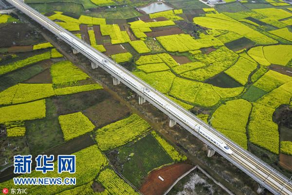 2017年3月13日,一列高鐵穿越油菜花田,感受春天里的“中國速度”。