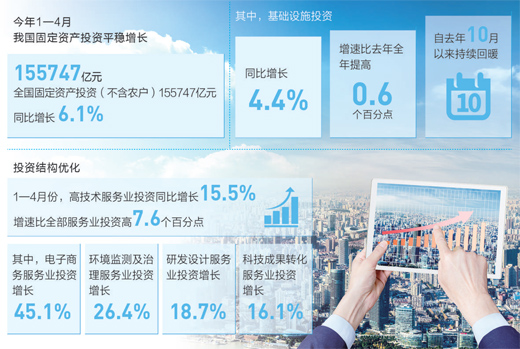 | 前4月,我國固定資產(chǎn)投資同比增長6.1%,增速比去年全年加快0.2個(gè)百分點(diǎn) | ||
