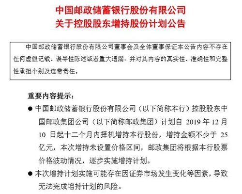 備受市場關(guān)注的是,同日,郵儲銀行還發(fā)布了《關(guān)于控股股東增持股份計劃公告》。公告稱,控股股東中國郵政集團(tuán)公司(下稱郵政集團(tuán))計劃自2019年12月10日起12個月內(nèi)擇機(jī)增持該行A股股份,增持金額不少于25億元。這體現(xiàn)了控股股東對郵儲銀行投資價值的高度認(rèn)可,也將為證券市場的穩(wěn)定運(yùn)行創(chuàng)造良好環(huán)境,彰顯“國家隊”擔(dān)當(dāng)。