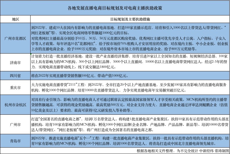 各地發(fā)展直播電商目標(biāo)規(guī)劃及對電商主播扶助政策 定目標(biāo):直播電商之城爭奪戰(zhàn) 6月20日,杭州市余杭區(qū)一系列直播電商政策發(fā)布的同時(shí),還提出要“打造直播經(jīng)濟(jì)第一區(qū)”。 中新經(jīng)緯記者注意到,多地在制定直播電商發(fā)展目標(biāo)時(shí),均用到了“直播電商之城”“直播電商之都”等類似表述。 例如青島市提出,到2022年,推進(jìn)實(shí)施直播電商“五個(gè)一”工程,包括培訓(xùn)1000名帶貨達(dá)人等,將青島打造成中國北方直播電商領(lǐng)先城市。廣州市提出打造“全國著名的直播電商之都”,培訓(xùn)1萬名帶貨達(dá)人的口號。