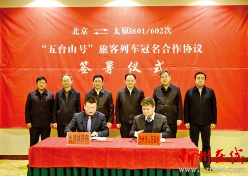 本報(bào)訊(記者 楊峰雷)12月27日,我市與太原鐵路局共同簽署冠名合作協(xié)議,北京至太原K601/K602次列車正式冠名為“五臺(tái)山號(hào)”。市委書(shū)記李俊明出席協(xié)議簽署儀式并致辭,市長(zhǎng)鄭連生主持,市委常委、常務(wù)副市長(zhǎng)趙志堅(jiān)出席。太原鐵路局局長(zhǎng)趙春雷專程來(lái)忻出席儀式。