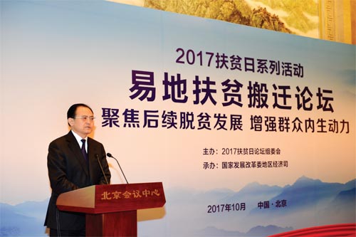 本次論壇以“聚焦后續(xù)脫貧發(fā)展,增強群眾內生動力”為主題,是2017 年扶貧日系列活動之一。來自國家發(fā)改委、人力資源社會保障部、國土資源部、交通運輸部、水利部、農(nóng)業(yè)部、商務部、中國人民銀行、國家林業(yè)局、國家旅游局、銀監(jiān)會、國務院扶貧辦、全國工商聯(lián)、國家開發(fā)銀行、中國農(nóng)業(yè)發(fā)展銀行等部門和單位有關司局負責同志,全國22 個有易地扶貧搬遷任務的省份發(fā)展改革委負責同志以及部分省、市、縣從事易地扶貧搬遷工作的干部群眾,帶動搬遷群眾脫貧致富的部分龍頭企業(yè)代表,共約100 人參加了論壇。