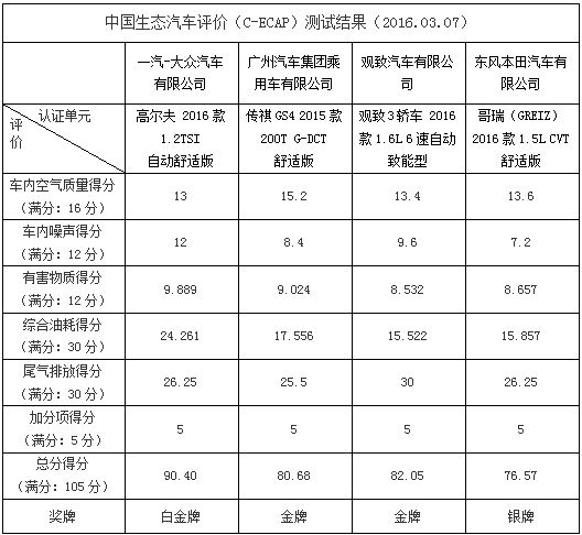 在本批次C-ECAP評價中,一汽-大眾高爾夫車型獲得截止至目前C-ECAP評價車型中的最高獎牌白金牌;廣汽傳祺是在C-ECAP中首次出現(xiàn)的中國品牌,與觀致車型一并獲得金牌;東風(fēng)本田哥瑞因在車內(nèi)噪音方面的相對得分較低,獲得銀牌。