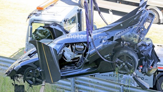 科尼塞克早上發(fā)布消息稱One:1打算在紐北刷新最快圈速紀(jì)錄。知情人表示,刷圈過程中,車輛在高速駛?cè)階denauer Forst彎時發(fā)生失控,車身撞跨賽道左側(cè)的護(hù)欄,進(jìn)而飛入草地,事故令One:1車身損毀嚴(yán)重,前保險杠折斷、擋風(fēng)玻璃破碎,尾部受損。