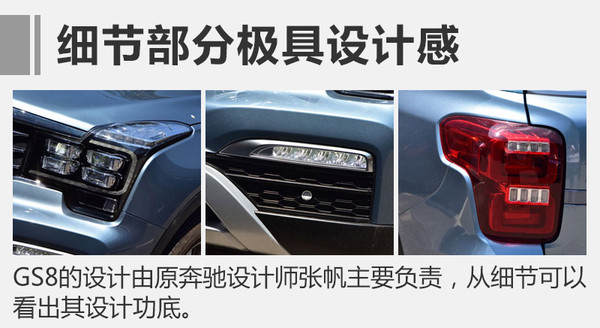 GS8的設計由原奔馳設計師張帆操刀,在內飾部分也較為洞察國內消費者的喜好。車內整體寬敞舒適,顏色采用偏暖的木色,打造一種家用溫馨感??臻g方面,GS8的長寬高分別為4810*1910*1770毫米,軸距2800毫米,采用7座布局。