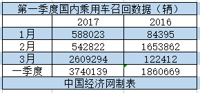 2016年,國內(nèi)乘用車召回數(shù)量首次突破一千萬輛,達到11331565輛。進入2017年,國內(nèi)乘用車召回數(shù)量繼續(xù)井噴,今年一季度累計召回汽車3740139輛,同比2016年一季度的1860669輛增長了101.01%。