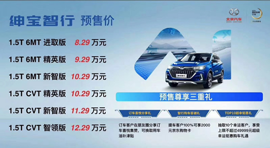 據(jù)悉,從8月31日成都車展開始,北京汽車已經(jīng)啟動了紳寶智行預售活動,并推出訂車喜悅分享禮、智行購車答謝禮、TOP10超幸鉅惠禮三重大禮,最高能省49999元。