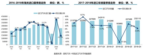 聚焦平行進口車市場,2018年,平行進口汽車銷量出現(xiàn)了5年來的首次下滑,且市場波動明顯。2018年,平行進口車銷量占進口車總銷量的12.6%,達13.97萬輛,同比下滑18.6%,下滑幅度遠超進口車市場整體表現(xiàn)。而中美貿(mào)易摩擦、國內(nèi)對車輛環(huán)保要求更為嚴格等因素,也導(dǎo)致平行進口車的銷量走低。各個季度的表現(xiàn)則更能體現(xiàn)該市場的巨幅波動,其中,平行進口車一季度銷量同比增長4.4%,表現(xiàn)穩(wěn)定;二季度卻出現(xiàn)50.2%的大幅下滑;三季度報復(fù)性回漲33.1%,四季度依舊疲軟;最終,平行進口車在2018年全年的銷量呈現(xiàn)大幅下滑的局面。