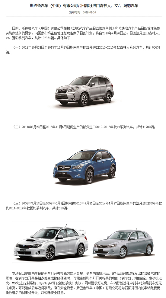 從召回原因來(lái)看,本月斯巴魯涉及132954輛汽車的召回不僅數(shù)量最大,召回原因也頗具“創(chuàng)意”。該批車輛因剎車燈開(kāi)關(guān)接觸方式不合理,受車內(nèi)清掃用品、化妝品等物品揮發(fā)出的含硅氣體的影響,在剎車燈開(kāi)關(guān)接觸點(diǎn)處生成絕緣薄膜時(shí),可能造成剎車燈開(kāi)關(guān)相關(guān)的功能(剎車燈、P檔解除、發(fā)動(dòng)機(jī)點(diǎn)火、VDC動(dòng)態(tài)控制系統(tǒng)、EyeSight駕駛輔助系統(tǒng))失效,同時(shí)警示燈點(diǎn)亮;車輛行駛過(guò)程中剎車時(shí)如果剎車燈無(wú)法點(diǎn)亮,可能造成后車追尾事故,存在安全隱患。