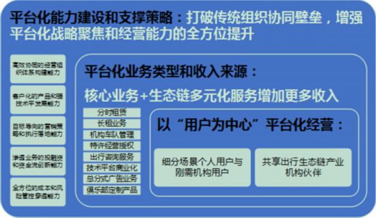 二是平臺化業(yè)務(wù)類型和收入來源,除了目前分時租賃、長租外,機構(gòu)車隊管理、特許經(jīng)營授權(quán)、出行咨詢服務(wù)、IT平臺應(yīng)用商業(yè)化、總分式廣告業(yè)務(wù)、會員俱樂部定制化產(chǎn)品等就是產(chǎn)業(yè)鏈收入新來源。