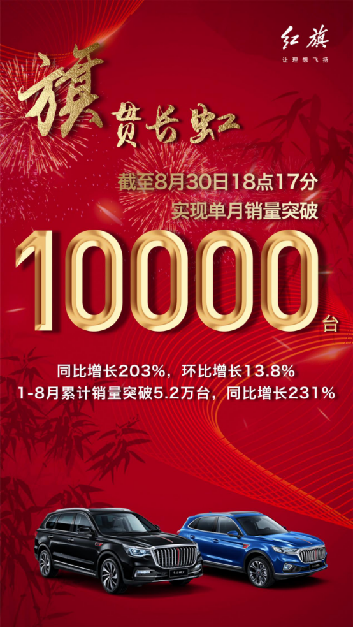 2019年8月30日18點17分,據(jù)紅旗官宣,紅旗品牌單月銷量已突破10000輛,同比增長203%,環(huán)比增長13.8%,至此,1-8月累計實現(xiàn)銷量5.2萬輛,同比增長231%。單月突破10000輛的成績,使紅旗首次躋身月銷萬輛俱樂部,這一極具里程碑意義的銷量數(shù)字,讓紅旗進入了主流豪華品牌陣營,書寫了紅旗誕生61年來新的紀(jì)錄,也驗證了紅旗正以氣貫長虹的勇猛之勢,實現(xiàn)著全方位的“跨越”。