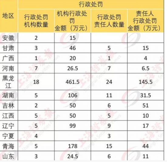 處罰機(jī)構(gòu)5個(gè)以上的地區(qū)有:黑龍江(處罰機(jī)構(gòu)18個(gè),對(duì)機(jī)構(gòu)罰款合計(jì)461.5萬(wàn)元;處罰責(zé)任人24個(gè),對(duì)責(zé)任人罰款合計(jì)145.5萬(wàn)元);重慶(處罰機(jī)構(gòu)10個(gè),對(duì)機(jī)構(gòu)罰款合計(jì)348萬(wàn)元;處罰責(zé)任人15個(gè),對(duì)責(zé)任人罰款合計(jì)131萬(wàn)元)。