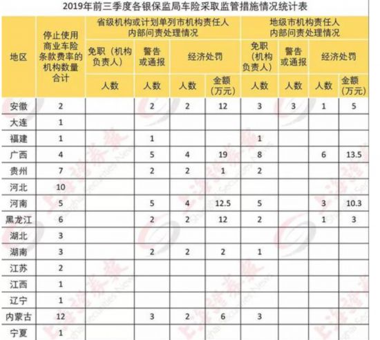 2019年前三季度各銀保監(jiān)局車險(xiǎn)行政處罰情況統(tǒng)計(jì)表