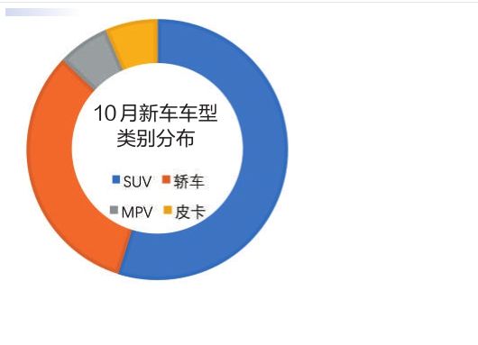 10月有34款SUV新車上市,占比由上月的57%微降至55%。轎車新車共有20款,占比由上月的34%降至32%。10月上市的MPV和皮卡均為4款,MPV車型占比同樣有小幅下滑,但全新車型比較吸引眼球。自2017年以來,國內(nèi)MPV市場(chǎng)持續(xù)較大幅度下滑,即便是過去一枝獨(dú)秀的上汽通用五菱也在今年出現(xiàn)了下滑。面對(duì)慘淡的車市,一直主攻低端市場(chǎng)的上汽通用五菱推出五菱宏光的升級(jí)版五菱宏光PLUS,其整體設(shè)計(jì)更為年輕、時(shí)尚,完全顛覆了以往消費(fèi)者對(duì)其產(chǎn)品的廉價(jià)印象。而皮卡新車占比為6%,是惟一實(shí)現(xiàn)占比正增長的車型類別,其中,長安凱程F70是長安與PSA集團(tuán)合作開發(fā)的全新皮卡產(chǎn)品。