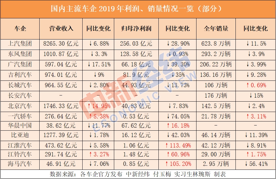 2019年車企成績單出爐,中新經(jīng)緯記者經(jīng)統(tǒng)計發(fā)現(xiàn),營收、凈利雙降幾乎成了各大主流車企的趨勢。而少數(shù)逆勢扭虧為盈者,或因變賣資產(chǎn)、或因收巨額補貼等均非主業(yè)所得……梳理得知,市場疲軟及銷量下滑是車企對全年表現(xiàn)不盡如人意的普遍解釋。