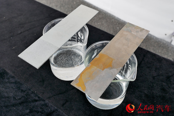 在汽車制造技術(shù)中,車身結(jié)構(gòu)在經(jīng)過焊接成型后,都需要通過電泳池進(jìn)行鍍鋅工藝,以防止車身在日后使用環(huán)境中被腐蝕,最終得到的“白車身”再進(jìn)行漆面噴涂工序。記者看到,實(shí)驗(yàn)人員將不鍍鋅鋼板和經(jīng)過鍍鋅鋼板分別放入8%的鹽酸溶液中,放置20秒左右,取出用水沖洗,然后靜置20分鐘,普通鋼板表面出現(xiàn)明顯紅色銹蝕,鍍鋅鋼板表面無明顯銹跡。
