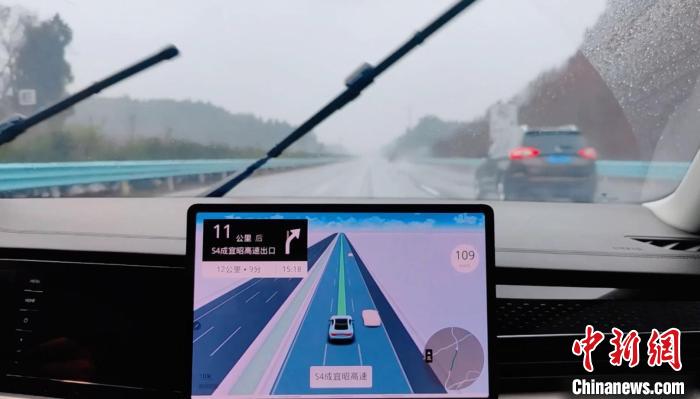 圖為國(guó)內(nèi)首個(gè)“智慧高速+車機(jī)導(dǎo)航”應(yīng)用在下雨的成宜高速上使用。 蜀道集團(tuán)供圖