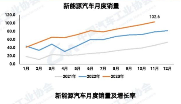 據(jù)中汽協(xié)數(shù)據(jù)顯示,2023年11月,我國汽車產(chǎn)量創(chuàng)歷史新高。汽車產(chǎn)銷量分別完成309.3萬輛和297萬輛,同比分別增長29.4%和27.4%。其中,新能源汽車月度產(chǎn)銷量首次雙超百萬輛,站上新臺(tái)階。11月,新能源汽車產(chǎn)銷量分別完成107.4萬輛和102.6萬輛,同比分別增長39.2%和30%。