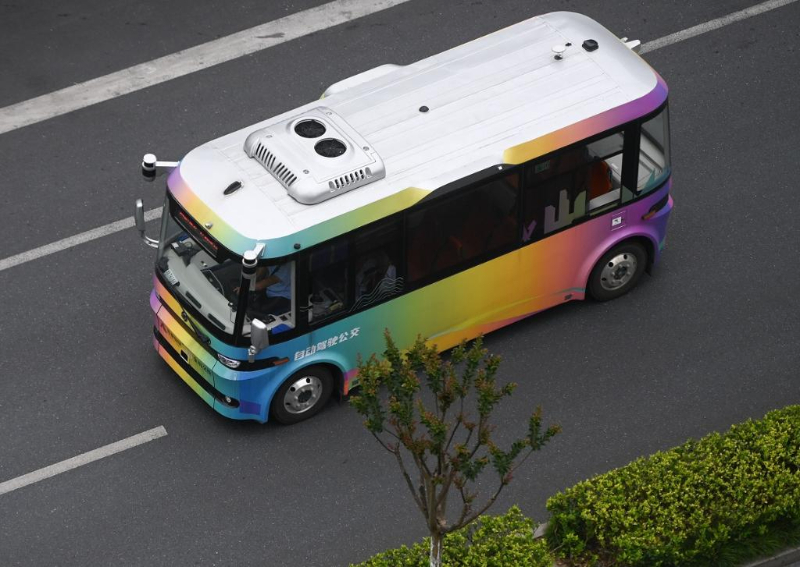 5月22日,自動(dòng)駕駛接駁示范線巴士行駛在杭州市余杭區(qū)未來科技城的道路上。新華社記者 黃宗治 攝