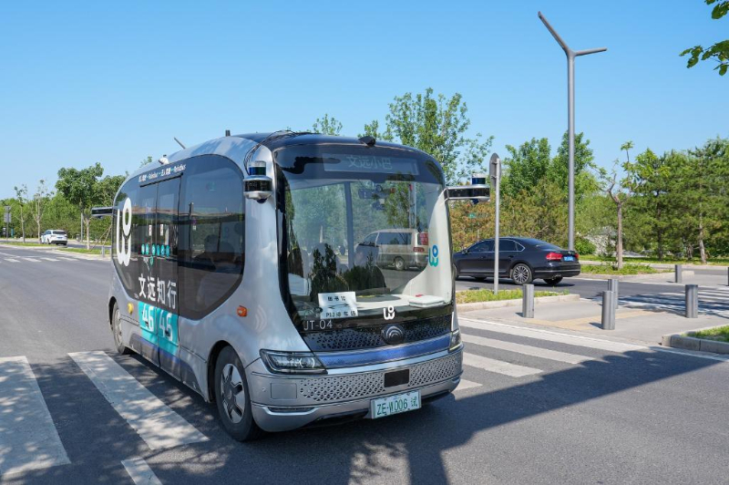 2024年5月21日,在北京城市副中心,一輛無人駕駛小巴在接送乘客。新華社記者 鞠煥宗 攝