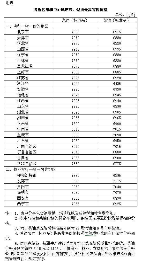 附:各省區(qū)市和中心城市汽、柴油最高零售價格