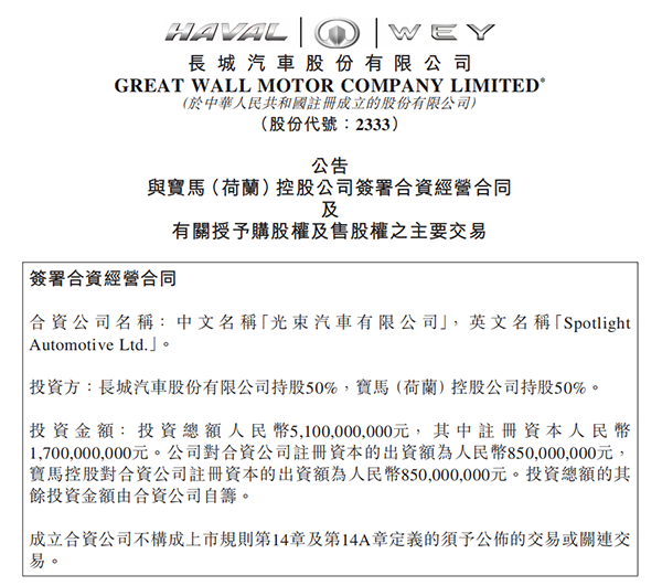 7月10日,長城、寶馬正式簽署合資經(jīng)營合同。兩家公司聯(lián)合出資51億元人民幣,成立注冊資本為17億元的光束汽車有限公司,注冊地為江蘇省張家港市。