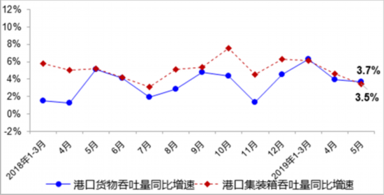 5月,全國港口完成貨物吞吐量12.0億噸,同比增長3.7%,其中內、外貿吞吐量分別增長5.2%和0.9%;完成集裝箱吞吐量2240萬標箱,同比增長3.5%。