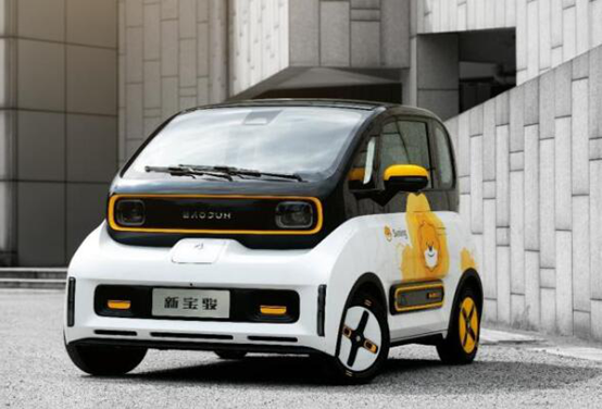 新寶駿E300小Biu是基于E300換裝了蘇寧的車身涂裝。在原版車型黑白雙色的基礎(chǔ)上,新車車頭裝飾、前包圍、外后視鏡、輪圈等部位都采用黃色的裝飾。此外,在側(cè)面還繪制有蘇寧品牌的IP——蘇格拉寧小獅子。