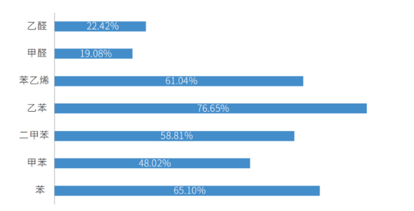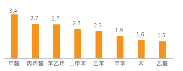 2022年度車內(nèi)空氣質(zhì)量測評結(jié)果顯示,常溫狀態(tài)下,除丙烯醛外,其余7種揮發(fā)性有機(jī)物均較2018-2021年有不同程度下降,一類致癌物甲醛和苯分別下降19.08%和65.10%,其余五種物質(zhì)也分別有22.42%至76.65%的下降。