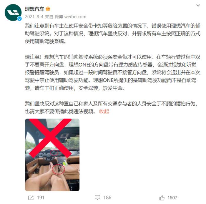 針對(duì)上述行為,理想汽車在2021年曾通過微博回應(yīng)稱,“理想汽車的輔助駕駛系統(tǒng)必須系安全帶才可以使用。在車輛行駛過程中雙手不要離開方向盤,理想ONE的方向盤帶有握力感應(yīng)傳感器,會(huì)通過視覺和聽覺報(bào)警提醒駕駛員,如果超過一段時(shí)間駕駛員不接管方向盤,系統(tǒng)將會(huì)退出并在本次駕駛中禁止使用輔助駕駛功能?!?/p>