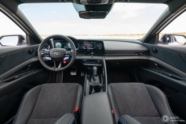 內(nèi)飾部分,伊蘭特N依舊保留了現(xiàn)代家族的雙聯(lián)屏布局,中控臺采用大面積皮革包袱。為進一步突出運動屬性,新車的方向盤、門飾板以及座椅等處,還加入了翻毛皮材質(zhì)。