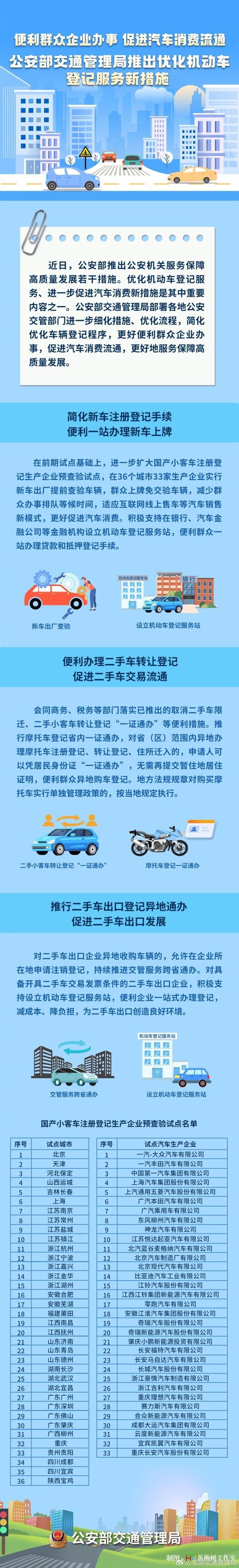 中新經(jīng)緯8月14日電 公安部交通管理局官方微博14日消息, 近日,公安部推出公安機關(guān)服務(wù)保障高質(zhì)量發(fā)展若干措施。優(yōu)化機動車登記服務(wù)、進一步促進汽車消費新措施是其中重要內(nèi)容之一。 公安部交通管理局部署各地公安交管部門進一步細化措施、優(yōu)化流程,簡化優(yōu)化車輛登記程序,更好便利群眾企業(yè)辦事,促進汽車消費流通,更好地服務(wù)保障高質(zhì)量發(fā)展。 簡化新車注冊登記手續(xù),便利一站辦理新車上牌。在前期試點基礎(chǔ)上,進一步擴大國產(chǎn)小客車注冊登記生產(chǎn)企業(yè)預(yù)查驗試點,在36個城市33家生產(chǎn)企業(yè)實行新車出廠提前查驗車輛,群眾上牌免交驗車輛,減少群眾辦事排隊等候時間,適應(yīng)互聯(lián)網(wǎng)線上售車等汽車銷售新模式,更好促進汽車消費。積極支持在銀行、汽車金融公司等金融機構(gòu)設(shè)立機動車登記服務(wù)站,便利群眾一站辦理貸款和抵押登記手續(xù)。 便利辦理二手車轉(zhuǎn)讓登記,促進二手車交易流通。會同商務(wù)、稅務(wù)等部門落實已推出的取消二手車限遷、二手小客車轉(zhuǎn)讓登記“一證通辦”等便利措施。推行摩托車登記省內(nèi)一證通辦,對省(區(qū))范圍內(nèi)異地辦理摩托車注冊登記、轉(zhuǎn)讓登記、住所遷入的,申請人可以憑居民身份證“一證通辦”,無需再提交暫住地居住證明,便利群眾異地購車登記。地方法規(guī)規(guī)章對購買摩托車實行單獨管理政策的,按當(dāng)?shù)匾?guī)定執(zhí)行。 推行二手車出口登記異地通辦,促進二手車出口發(fā)展。對二手車出口企業(yè)異地收購車輛的,允許在企業(yè)所在地申請注銷登記,持續(xù)推進交管服務(wù)跨省通辦。對具備開具二手車交易發(fā)票條件的二手車出口企業(yè),積極支持設(shè)立機動車登記服務(wù)站,便利企業(yè)一站式辦理登記,減成本、降負擔(dān),為二手車出口創(chuàng)造良好環(huán)境。