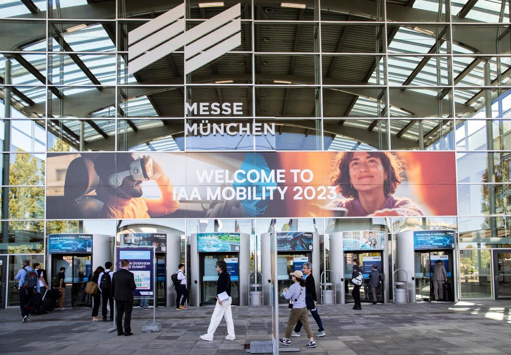 9月5日,在德國慕尼黑,人們走入2023年德國國際汽車及智慧出行博覽會會場。新華社記者張帆攝