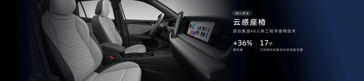 舒適體驗上,全新探岳L配備了專為中國用戶研發(fā)的云感座椅,座椅柔軟度提升了36%,坐上去可以完全放松。除柔軟外,云感座椅還擁有Audi A8同款人體工學(xué)座椅設(shè)計,提供身體從靠背到大腿共17處不同部位的差異化定制支撐,即使長途駕駛也不感疲憊,讓更多用戶體驗到越級的舒適。