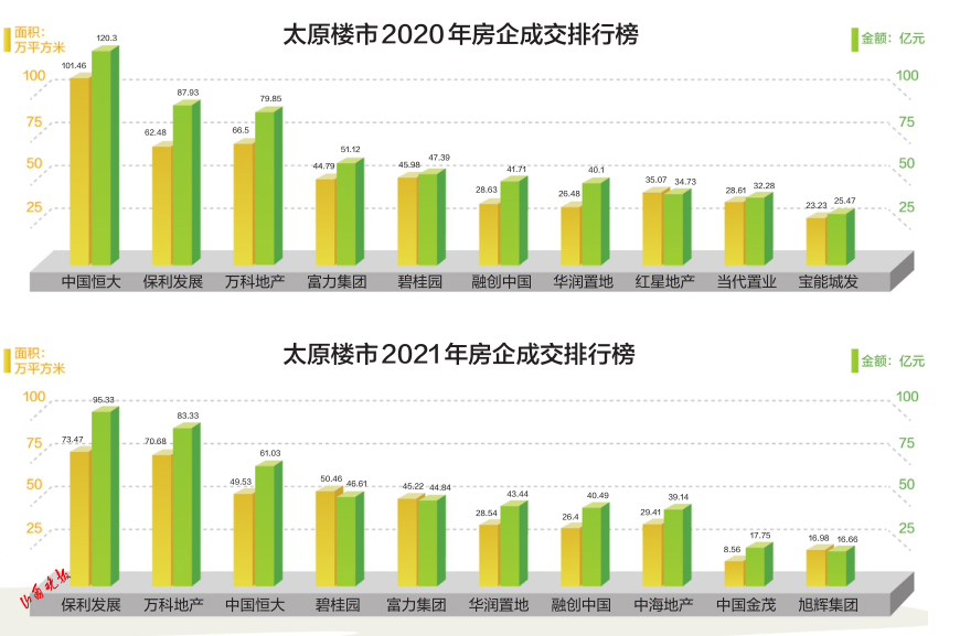 同時(shí),2020年排名第一的中國(guó)恒大,在太原的年銷(xiāo)售額超過(guò)了120億元;2021年排名第一的保利發(fā)展銷(xiāo)售額為95.33億元,沒(méi)有跨過(guò)百億門(mén)檻。在成交面積方面,恒大2020年的總銷(xiāo)售面積超過(guò)了100萬(wàn)平方米,而2021年保利發(fā)展的總銷(xiāo)售面積為73.47萬(wàn)平方米,比上一年的銷(xiāo)售面積冠軍縮水了近三成。