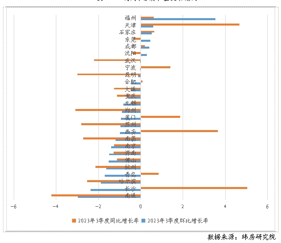 住房大數(shù)據(jù)監(jiān)測(cè)的26個(gè)二線城市中,僅有6個(gè)城市的住房租金環(huán)比上漲,20個(gè)城市的住房租金環(huán)比下跌。其中,南通和長(zhǎng)沙降幅最高,分別為2.97%和2.36%,其余城市降幅均不超過2%;福州漲幅最高為3.53%,其余城市漲幅均不超過1%。與2022年三季度末相比,住房大數(shù)據(jù)監(jiān)測(cè)的26個(gè)二線城市中有16個(gè)城市住房租金同比下降,10個(gè)城市住房租金同比上漲。其中,南通、鄭州、昆明等城市住房租金同比跌幅最大,分別下跌4.23%、3.09%和3%;長(zhǎng)沙、天津、西安等城市住房租金同比漲幅最大,分別上漲5.03%、4.66%和3.65%。
