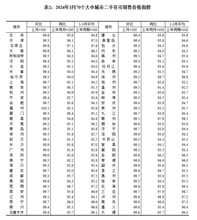 2024年3月70個大中城市二手住宅銷售價格指數。 截圖自國家統計局官網