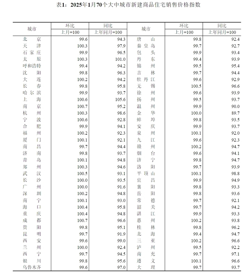 國家統(tǒng)計(jì)局城市司首席統(tǒng)計(jì)師王中華解讀稱:“2025年1月份,70個(gè)大中城市中,一線城市商品住宅銷售價(jià)格環(huán)比繼續(xù)上漲,二三線城市環(huán)比總體略降;一二三線城市同比降幅均持續(xù)收窄。”