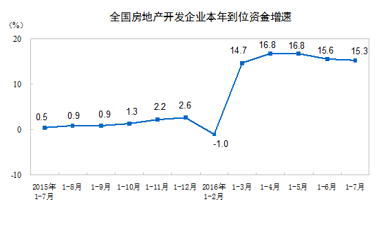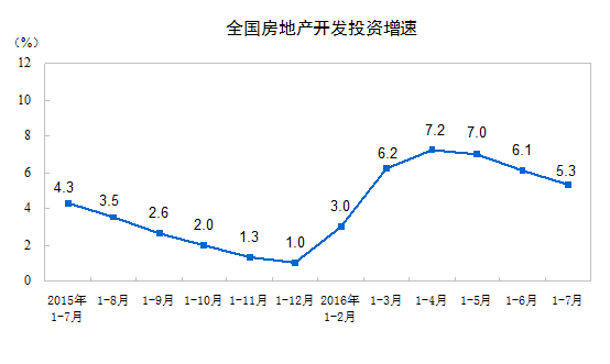 2016年1-7月份,全國房地產(chǎn)開發(fā)投資55361億元,同比名義增長5.3%,增速比1-6月份回落0.8個百分點。其中,住宅投資36981億元,增長4.5%,增速回落1.1個百分點。住宅投資占房地產(chǎn)開發(fā)投資的比重為66.8%。