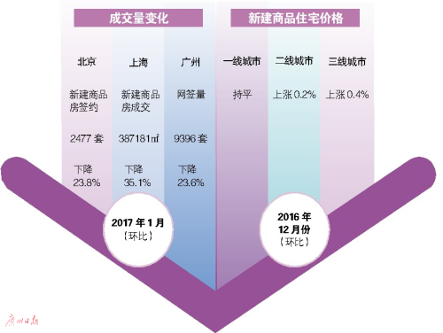 國(guó)家統(tǒng)計(jì)局70個(gè)大中城市住宅銷售價(jià)格統(tǒng)計(jì)數(shù)據(jù)顯示,2016年12月份有46座城市新建商品住宅價(jià)格環(huán)比上漲,2016年11月份為55座城市上漲,價(jià)格環(huán)比上漲的城市個(gè)數(shù)在減少。其中一線城市新建商品住宅價(jià)格環(huán)比由上月的上漲0.1%轉(zhuǎn)為持平;二線城市新建商品住宅價(jià)格上漲0.2%,比上月回落0.2個(gè)百分點(diǎn);三線城市新建商品住宅價(jià)格上漲0.4%,比上月回落0.4個(gè)百分點(diǎn)。15個(gè)一線和熱點(diǎn)二線城市因地制宜、因城施策實(shí)施調(diào)控政策以來(lái),政策效果明顯,房?jī)r(jià)快速趨穩(wěn)回落。其中廣州市已連續(xù)三個(gè)月環(huán)比漲幅回落。