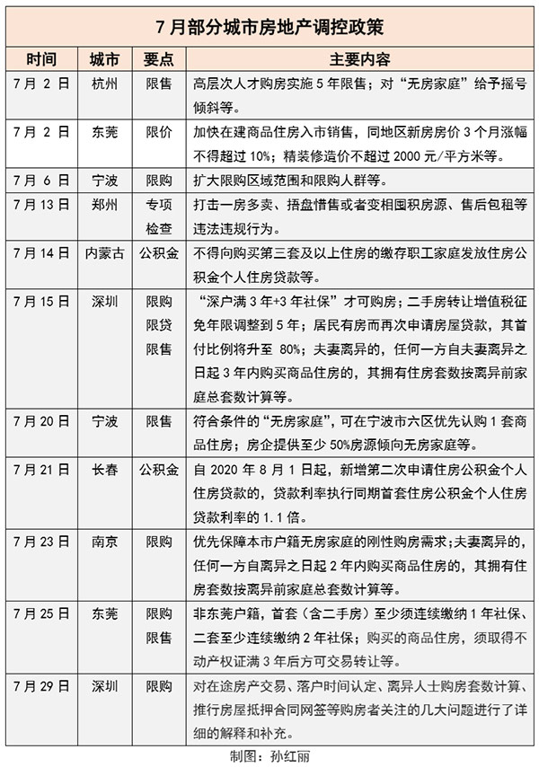 記者梳理發(fā)現(xiàn),7月以來(lái),多個(gè)城市圍繞收緊購(gòu)房資格、限制資金違規(guī)進(jìn)入房地產(chǎn)、支持無(wú)房家庭購(gòu)房、抑制投機(jī)炒房等方面進(jìn)行調(diào)控。