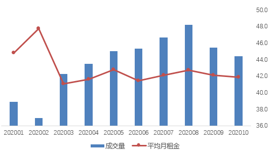 2020年1-10月貝殼重點18城租賃成交量及租金走勢 數(shù)據(jù)來源:貝殼研究院