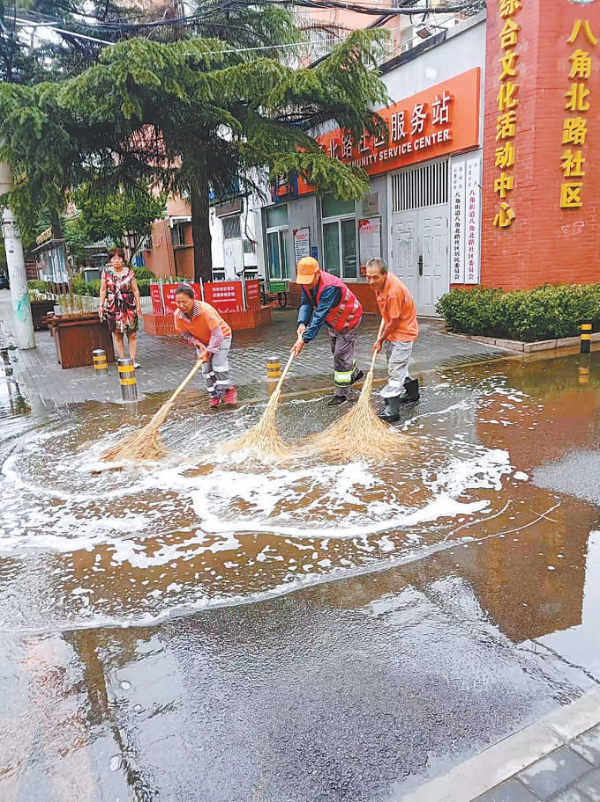 一次雨后,八角北路社區(qū)內(nèi),石房物業(yè)工作人員在清理積水。