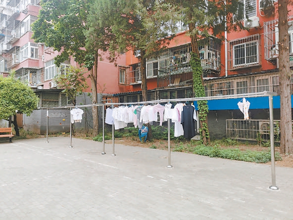 走出古城南路社區(qū)東門,沿古城東街北行400余米右轉(zhuǎn)進(jìn)入八角北路社區(qū),只見幾株高大的國(guó)槐及道邊的綠藤錯(cuò)落有致。再向里走,是一塊寬闊的活動(dòng)場(chǎng)地,北側(cè)建有一排不銹鋼晾衣架,架上晾滿了衣服。“有居民提出家里陽(yáng)臺(tái)上晾衣服不方便,我們特地尋找合適地方,為這些社區(qū)建了晾衣架?!北本┦课飿I(yè)有限公司(以下簡(jiǎn)稱石房物業(yè))副經(jīng)理孫偉說(shuō)。