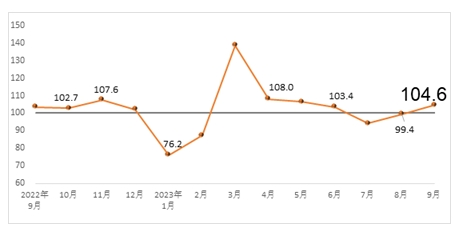 據(jù)中國建筑材料聯(lián)合會發(fā)布的數(shù)據(jù)顯示,2023年9月份建筑材料工業(yè)景氣指數(shù)為104.6點,較上月回升5.2點,高于臨界點,處于景氣區(qū)間,建筑材料工業(yè)運行有所恢復。
