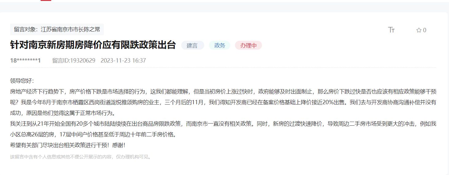 在領導留言板上,11月23日,有網(wǎng)友表示“針對南京新房期房降價應有限跌政策出臺”。該網(wǎng)友留言道,“房地產(chǎn)經(jīng)濟下行趨勢下,房產(chǎn)價格下跌是市場選擇的行為,這我們都能理解,但是當初房價上漲過快時,政府能夠及時出面制止,那么房價下跌過快是否也應該有相應政策能夠干預呢?我是今年8月于南京市棲霞區(qū)西崗街道瀧悅雅頌購房的業(yè)主,3個月后的11月,我們得知開發(fā)商已經(jīng)在備案價格基礎上降價接近20%出售。我們?nèi)ヅc開發(fā)商協(xié)商溝通補償并沒有成功,原因是他們覺得這屬于正常市場行為。 我關注到從21年開始全國有20多個城市陸陸續(xù)續(xù)在出臺商品房限跌政策,而南京市一直沒有相關政策。同時,新房的過度快速降價,導致周邊二手房市場受到更大的沖擊,例如我小區(qū)總高26層的房,17層中間戶價格甚至低于周邊十年前二手房價格?!?/p>