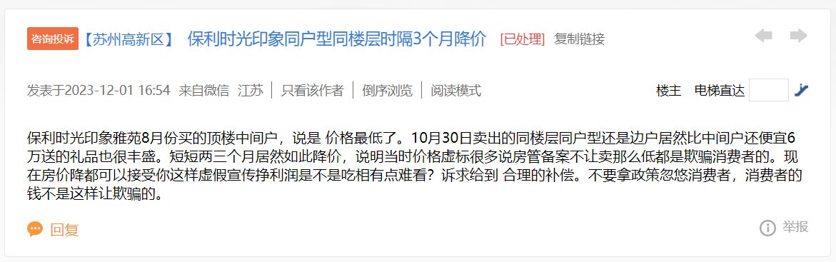 澎湃新聞在蘇州陽光便民網(wǎng)上看到,12月1日,有網(wǎng)友留言表示:蘇州高新區(qū)保利時光印象雅苑項目,“8月份買的頂樓中間戶,說是價格最低了。10月30日賣出的同樓層同戶型還是邊戶,居然比中間戶還便宜6萬元,送的禮品也很豐盛。短短兩三個月居然如此降價,說明當時價格虛標?!?/p>