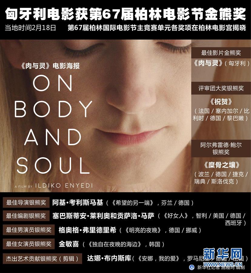 新華社柏林2月18日電(記者張毅榮)第67屆柏林國(guó)際電影節(jié)主競(jìng)賽單元各獎(jiǎng)項(xiàng)18日在柏林電影宮揭曉,匈牙利電影《肉與靈》獲最佳影片金熊獎(jiǎng)。