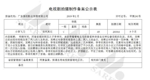 其中,改編劇本較多。古龍武俠小說(shuō)《小李飛刀》又將翻拍,備案顯示,該劇將拍45集,制作周期5個(gè)月,將于2019年6月開(kāi)拍,而劇情則與老版基本一致。